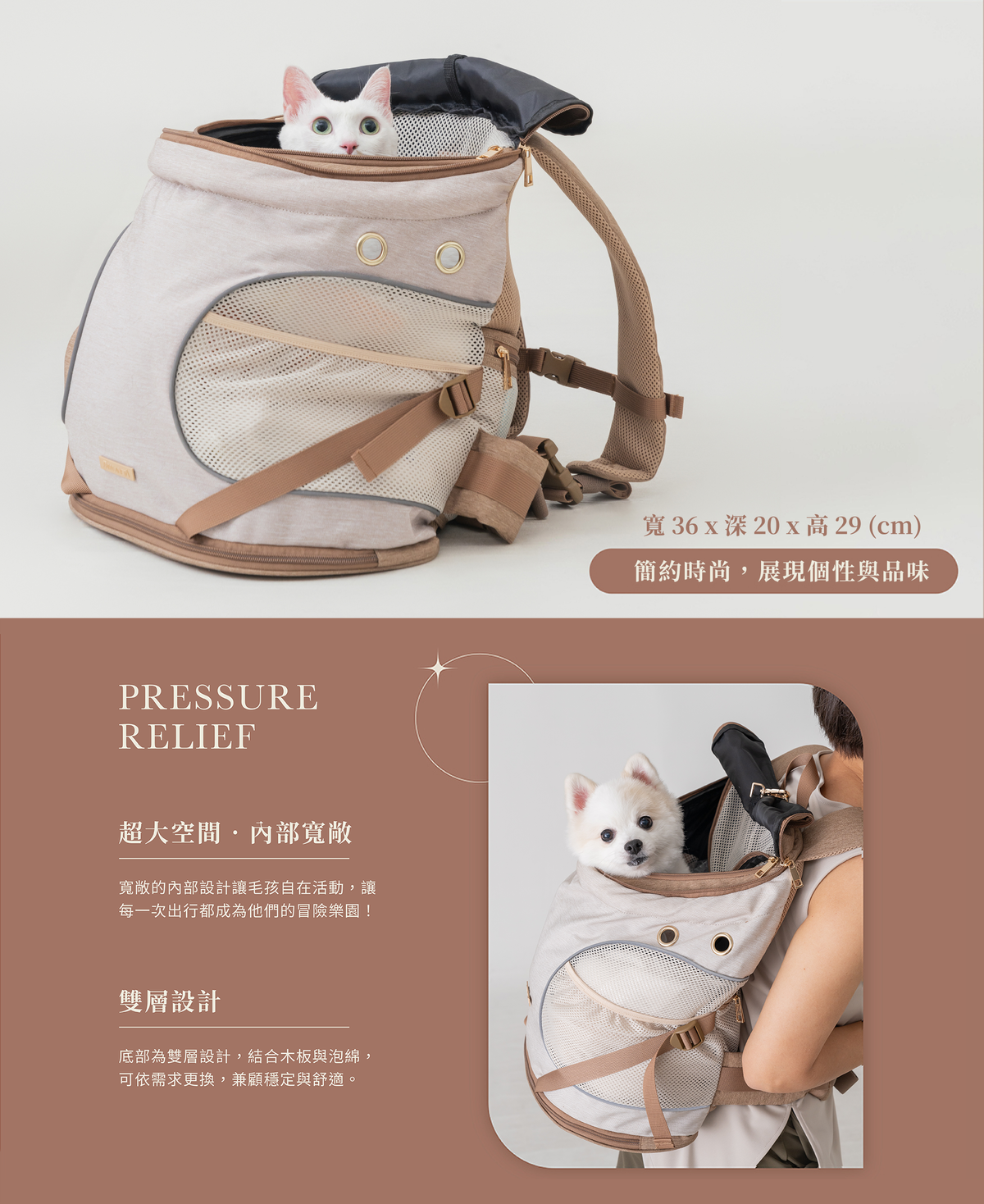 為了打造適合中小型犬貓的外出包,Infinitas 外出包設計為 36*20*39 公分,內部空間寬敞、結構穩固,底部更採雙層設計,包含木板與泡棉層,能視需求更換,讓背包在穩固性與舒適性之間取得最佳平衡。