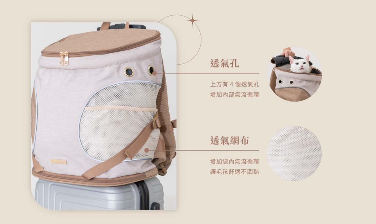 因此,Infinitas 外出包具備多處透氣網布與 4 個透氣孔洞,即便在炎熱天氣或長時間外出下,也能保持包內通風涼爽,讓毛孩舒適不悶熱。