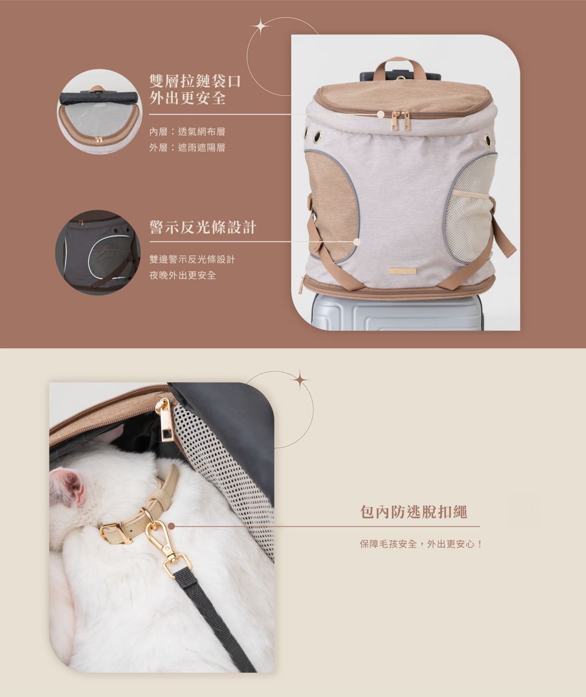 為了打造安全的外出包,讓主人與毛孩都放心,Infinitas 外出包內建防脫逃安全扣繩及雙層拉鍊袋口設計,能防止毛孩突然跳出。外層還加入警示反光條設計,夜間也能安心出行,守護每一段旅程的安全。