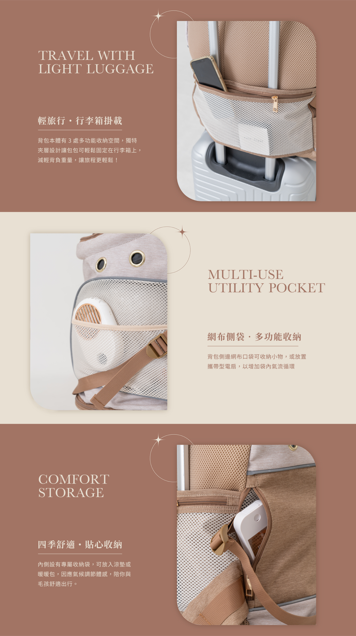 針對機能性的需求,Infinitas 外出包也都替主人們設想周到,背包主體設有 3 處多功能收納空間,背面更具行李箱掛載設計,外出旅行可直接掛在行李箱上移動,貼心又實用。