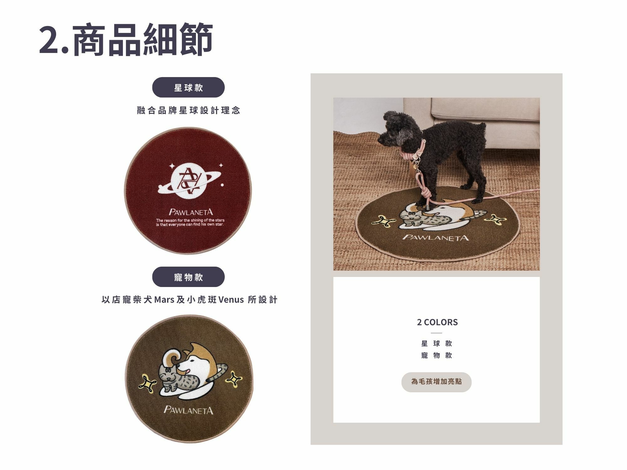 ●店寵柴犬Mars與小虎斑Venus可愛形象地墊,增添家中溫馨。