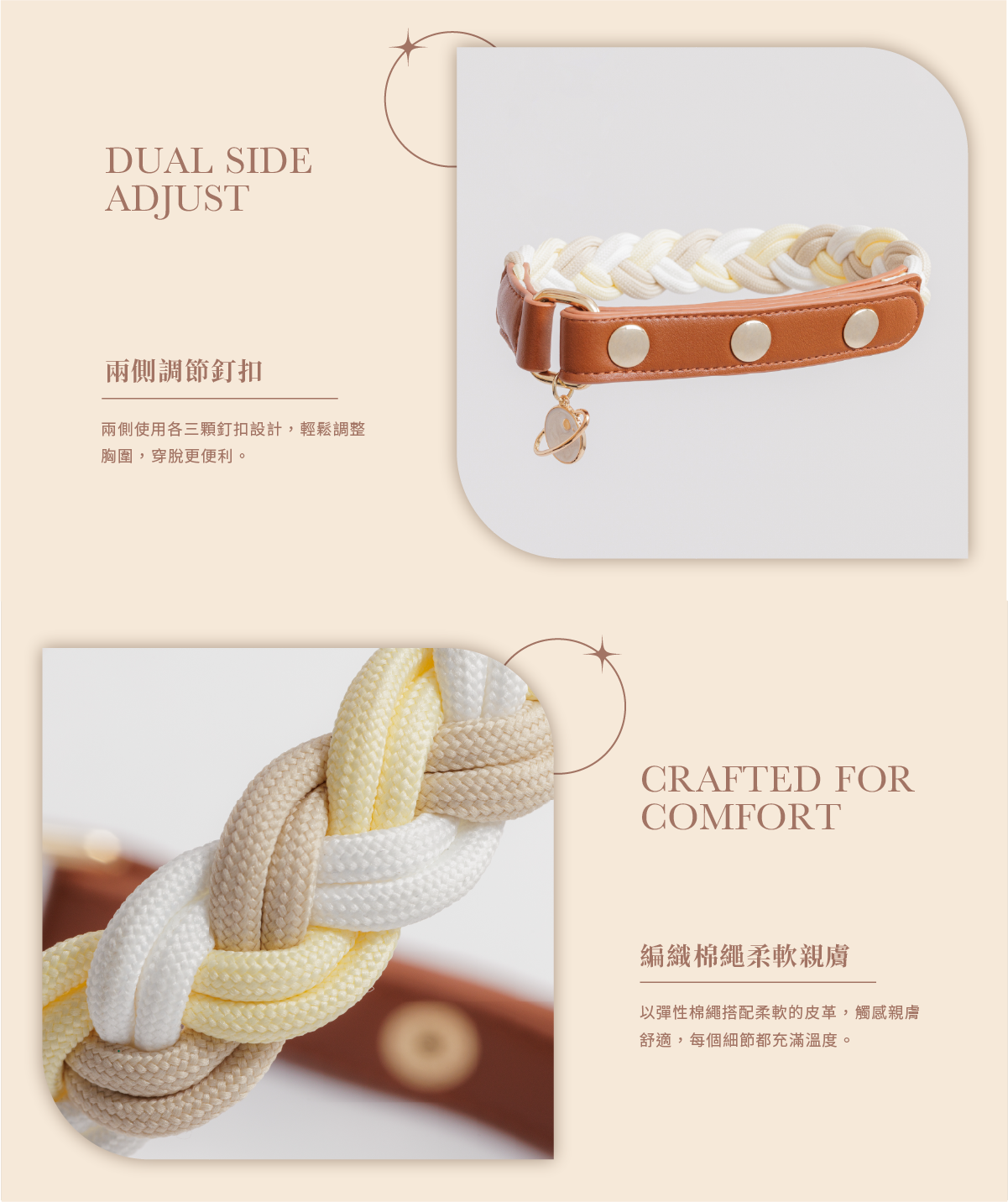 ● 項圈採用柔軟又透氣的編織棉繩,即使長時間佩戴,也不勒頸部,給予寵物最大的舒適感。三顆釘扣設計,讓調整與穿脫變得輕鬆快速,無論是在家中準備出門,還是戶外需要即時處理,都是貼心便利的好幫手。