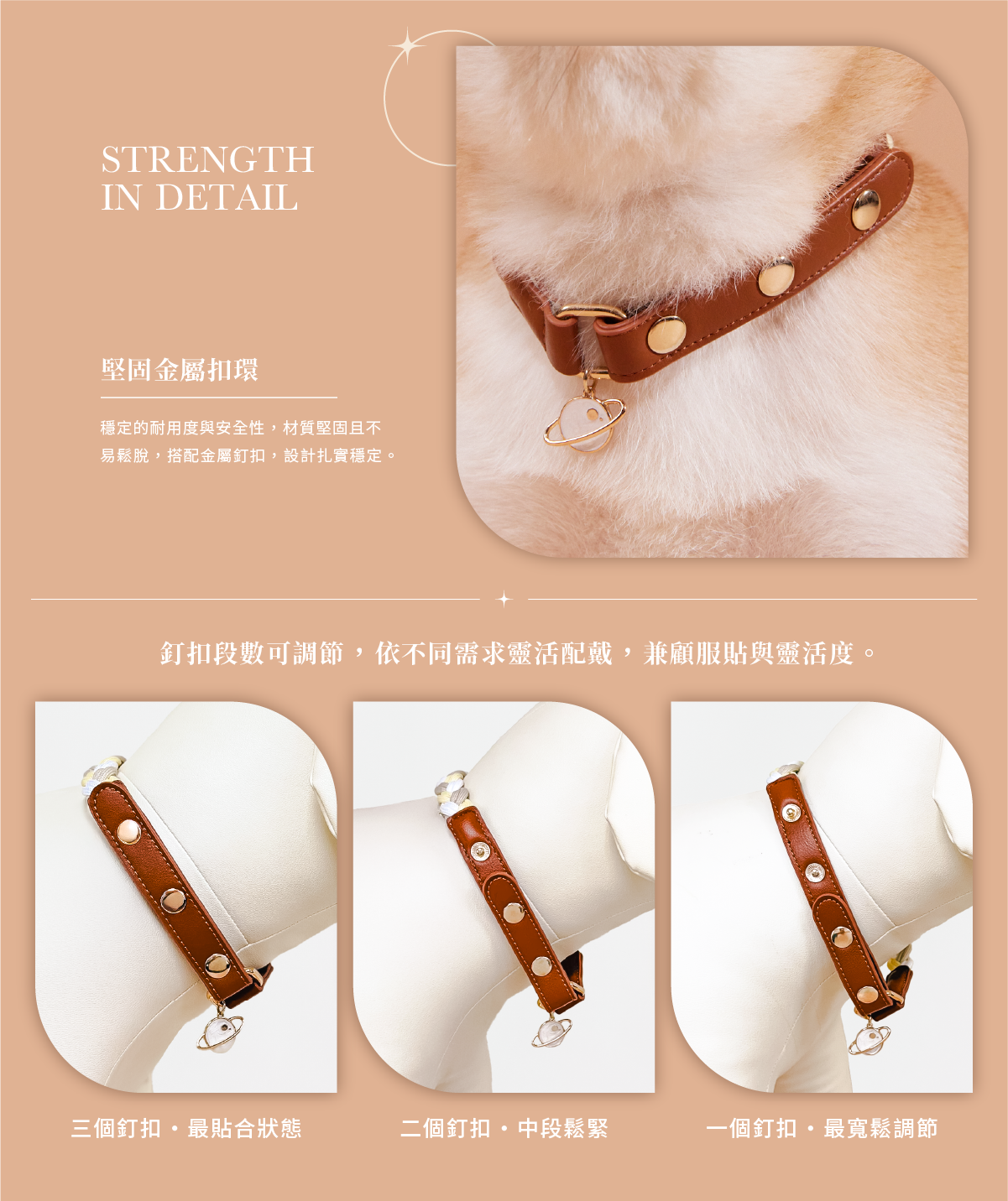 ● 特製釘釦 3 段調節,項圈穿戴快速輕鬆。