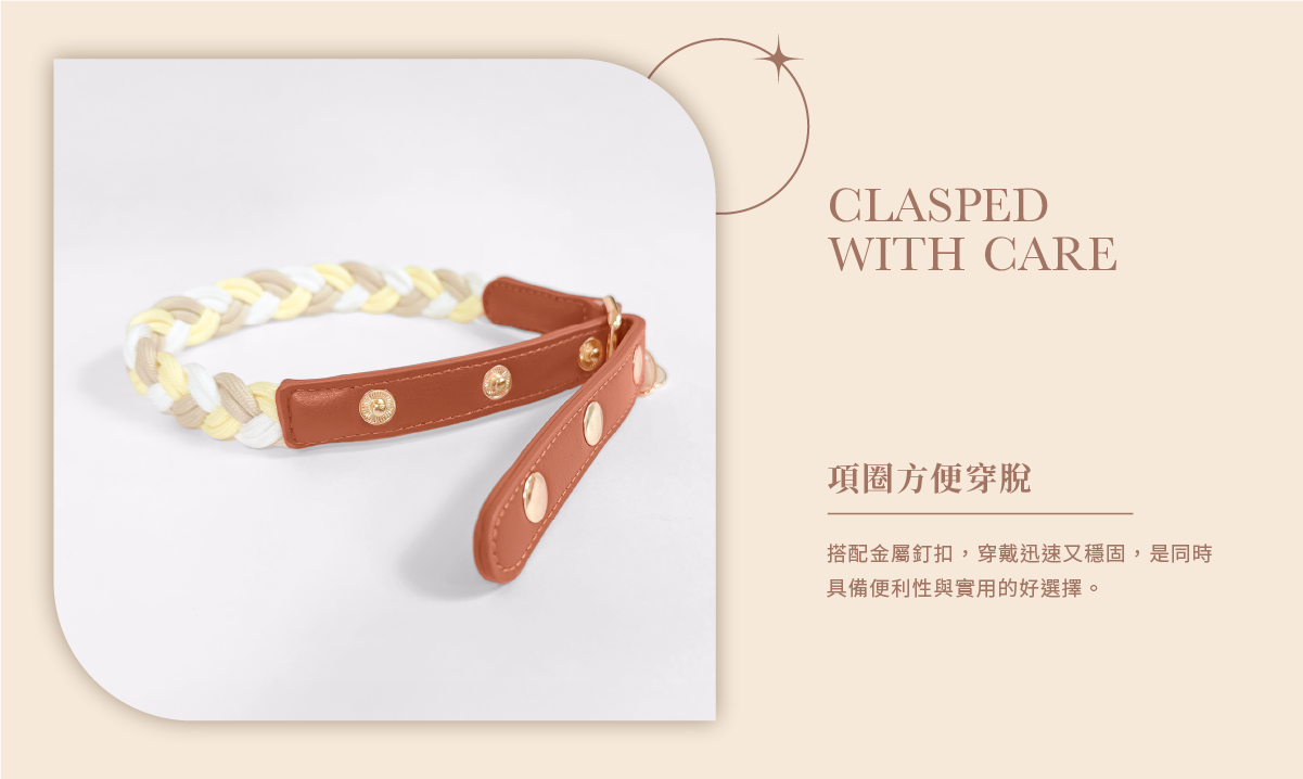 ● 彈性編織棉繩項圈柔軟親膚,緩衝拉力防磨傷。