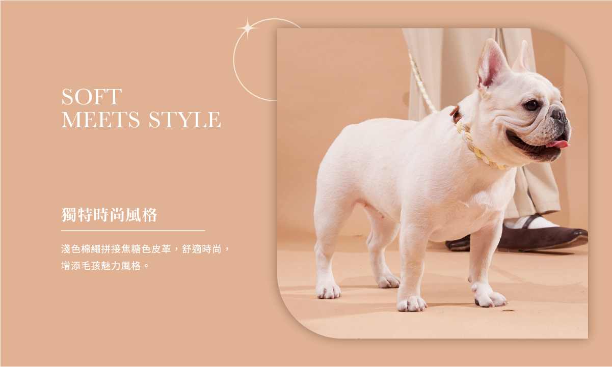 ● 項圈採用編織棉繩與焦糖色皮革拼接,造型獨特。