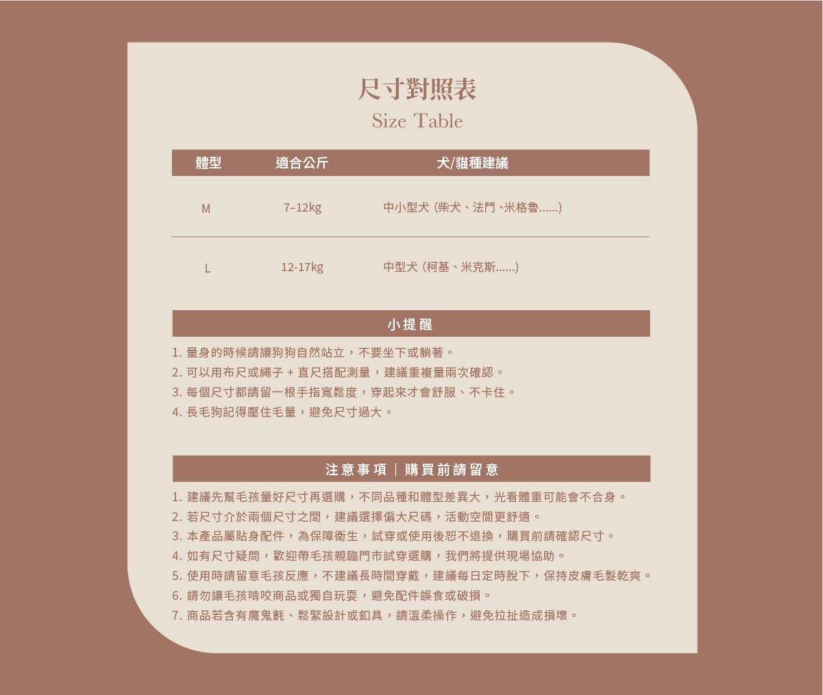● 尺寸分為M、L ,M 適用:柴犬、柯基、法鬥、米格魯、米克斯等;L 適用:柯基、米克斯等。成犬、全齡犬、中型犬皆適合。