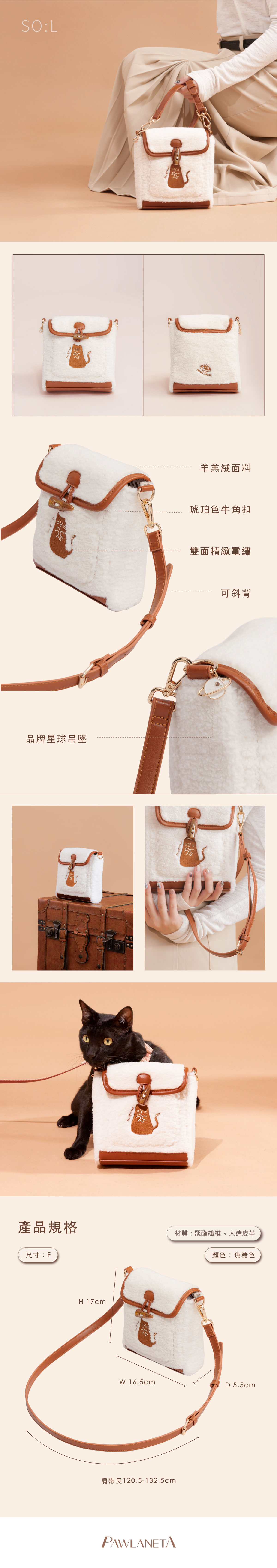 ●羊羔絨、皮革與精緻電繡貓貓設計,風格可愛俏皮。