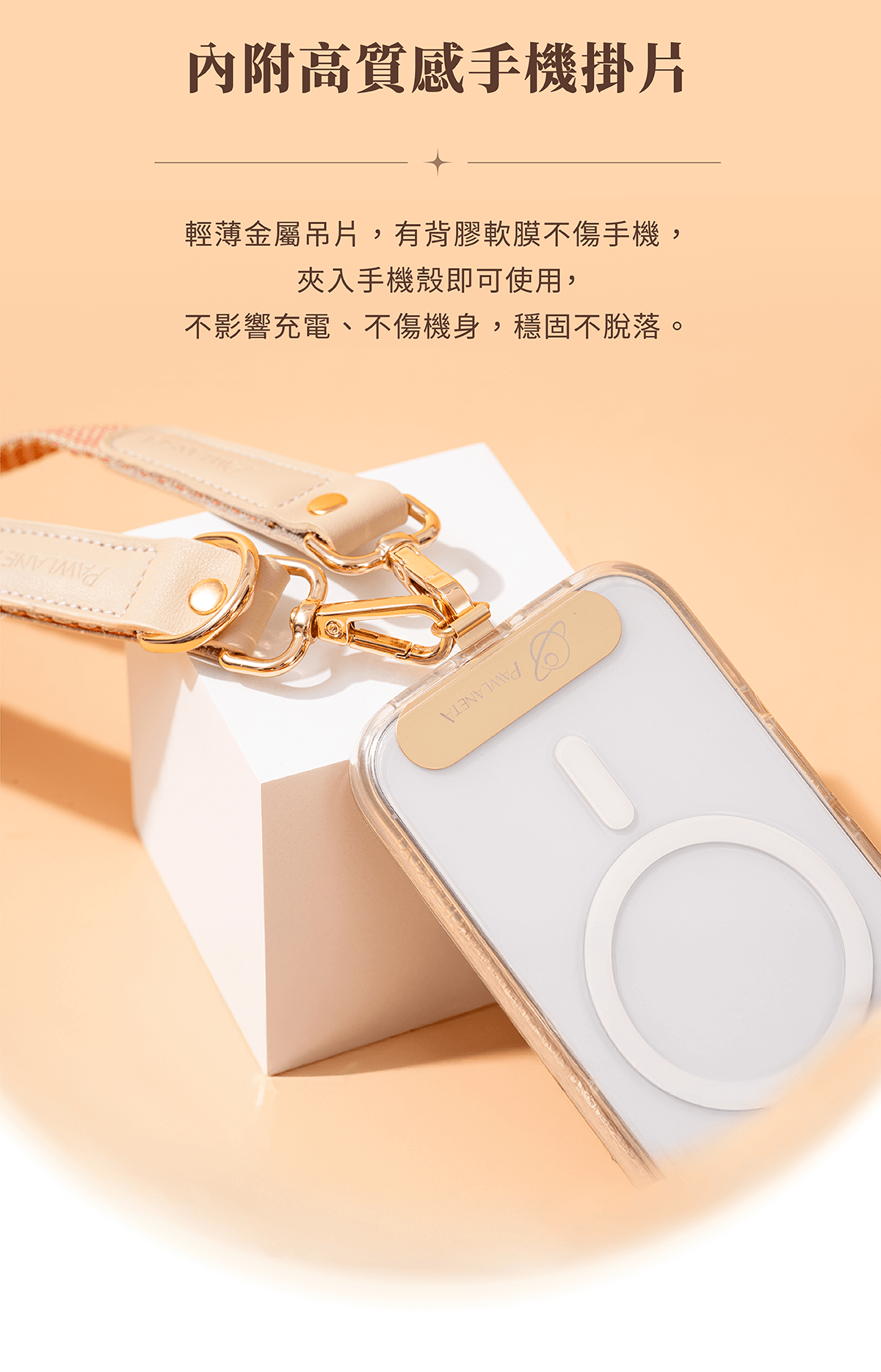 📲隨繩附贈通用掛片,安裝穩固不費力、不擋充電孔,從此不怕掛片斷裂手機掉落。